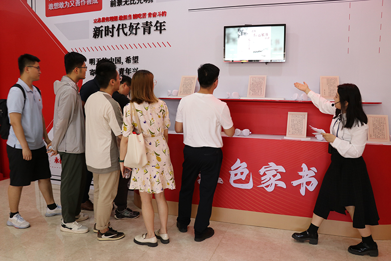 “紅色家書”互動墻前,一封封“紅色家書”通過數字智能互動技術播放,團員青年們駐足閱讀,認真聆聽,追憶革命先輩家國情懷,體悟感受信仰力量。