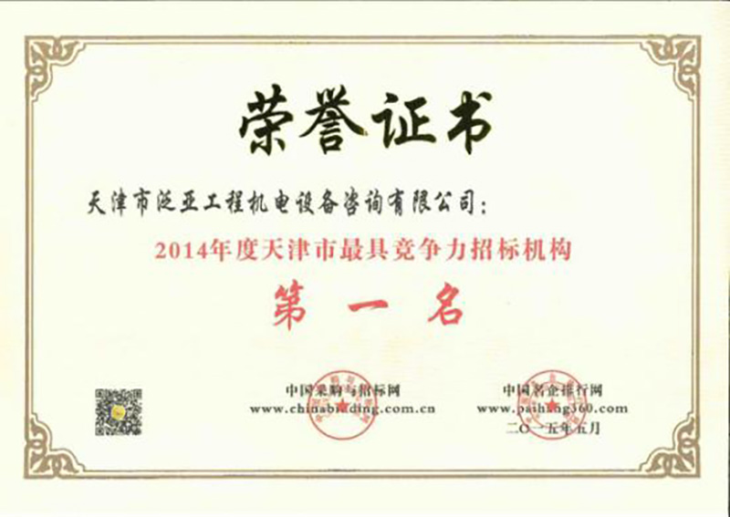 2014年度天津市最具競爭力招標機構第一名