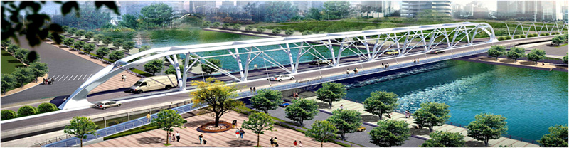 該橋橫跨張自忠路、海河以及海河東路。橋梁總長180米,主跨128米,面積4985.2 平米,為自錨式桁吊組合鋼結構橋。總投資2.65億元。該橋梁設計在國內外尚屬首創。